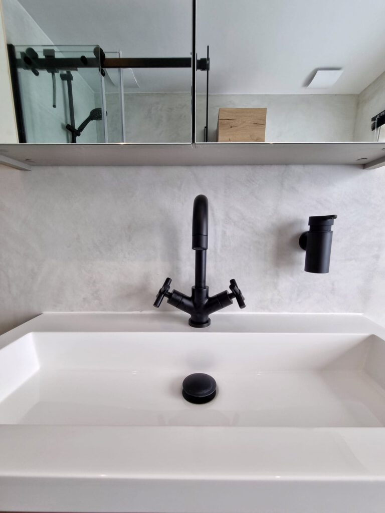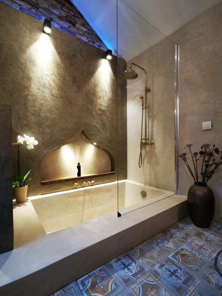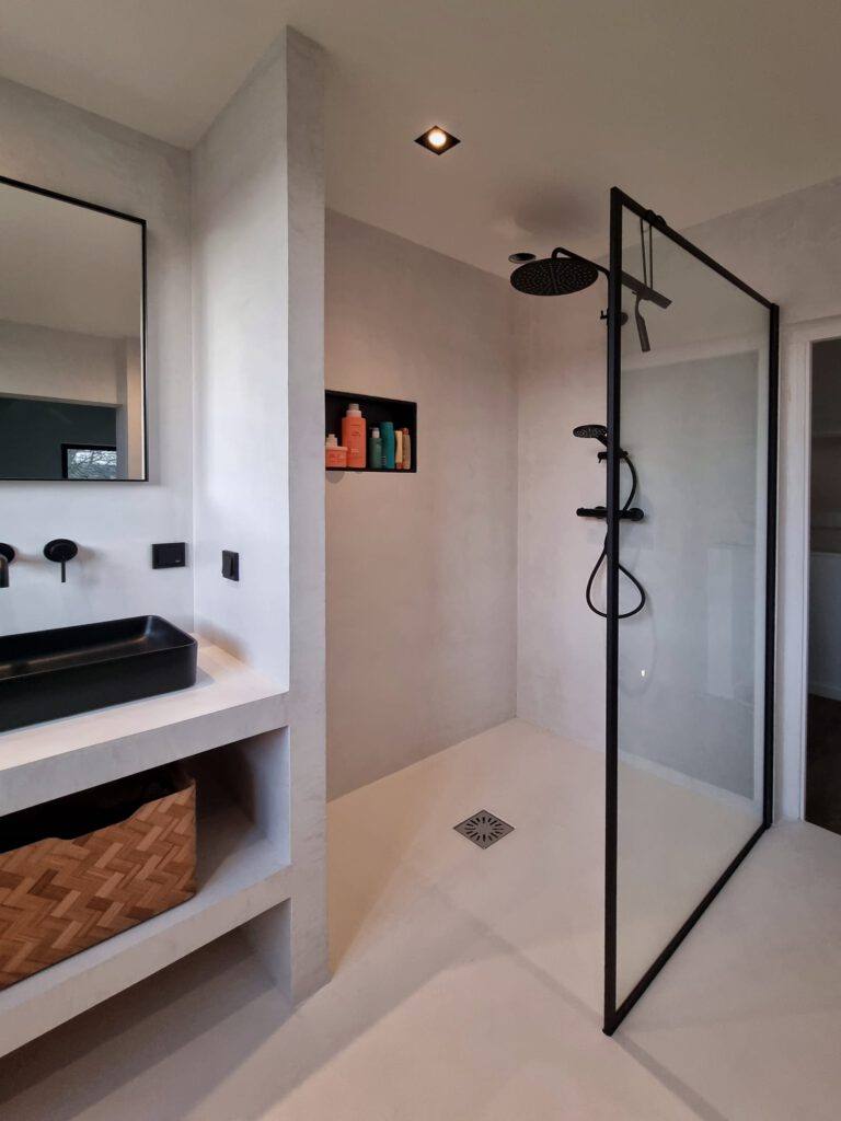 Mortex is volledig naadloos en waterdicht. Dus bijzonder geschikt voor gebruik in natte ruimtes. Mortex betonlook mortel is ondoordringbaar en wordt afgewerkt met een coating. Hierdoor voelt het oppervlakte prettig aan en is deze eenvoudig te reinigen. Douche, badkamer, wastafel, toilet: Met Mortex creëren we in uw eigen huis een ware Spa beleving.